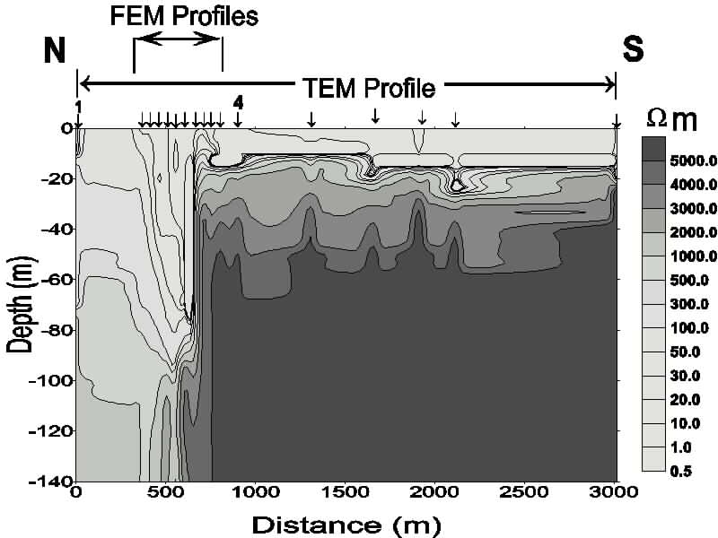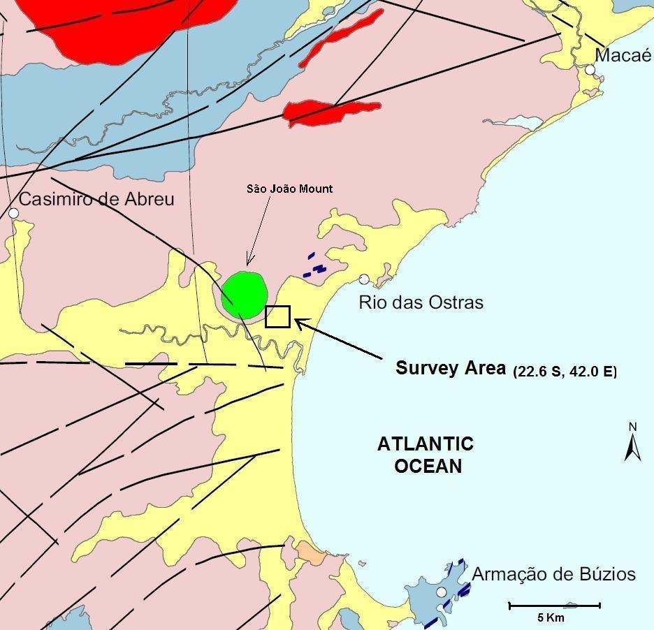 Um estudo geofísico piloto foi realizado na Planície Litoral Norte do Estado do Rio de Janeiro (Brasil), próximo da cidade de Rio das Ostras, 200 km ao NE da cidade do Rio de Janeiro. Esta região é caracterizada pela escassez de água potável e pela existência de intrusão salina, causada principalmente pela presença de uma geologia complexa do Quaternário e por uma exploração excessiva do aqüífero. A pesquisa foi realizada através do emprego de métodos geofísicos magnéticos e eletromagnéticos (domínios do tempo - TEM e freqüência - FEM), a fim de avaliar a eficácia destes métodos nessas condições geológicas, como também, formular uma pesquisa hidrogeológica mais abrangente da região no futuro. A interpretação unidimensional (1D) dos dados dos perfis FEM e das sondagens TEM foram capazes de revelar as diferentes formações geológicas, localizando o aqüífero e revelando o contato das águas doce – salina. Por outro lado, o método magnético mostrou a presença de uma falha geológica com direção NE-SW, a qual fica localizada no contato geológico entre areia e argila, coincidentemente com o contato das águas doce - salina. Os resultados indicaram um futuro promissor para a utilização de métodos geofísicos eletromagnéticos na região em prospecções de pequena escala e as possibilidades de uso do método magnético em estudos regionais, na indicação dos locais mais adequados para localizar poços produtivos de água potável.